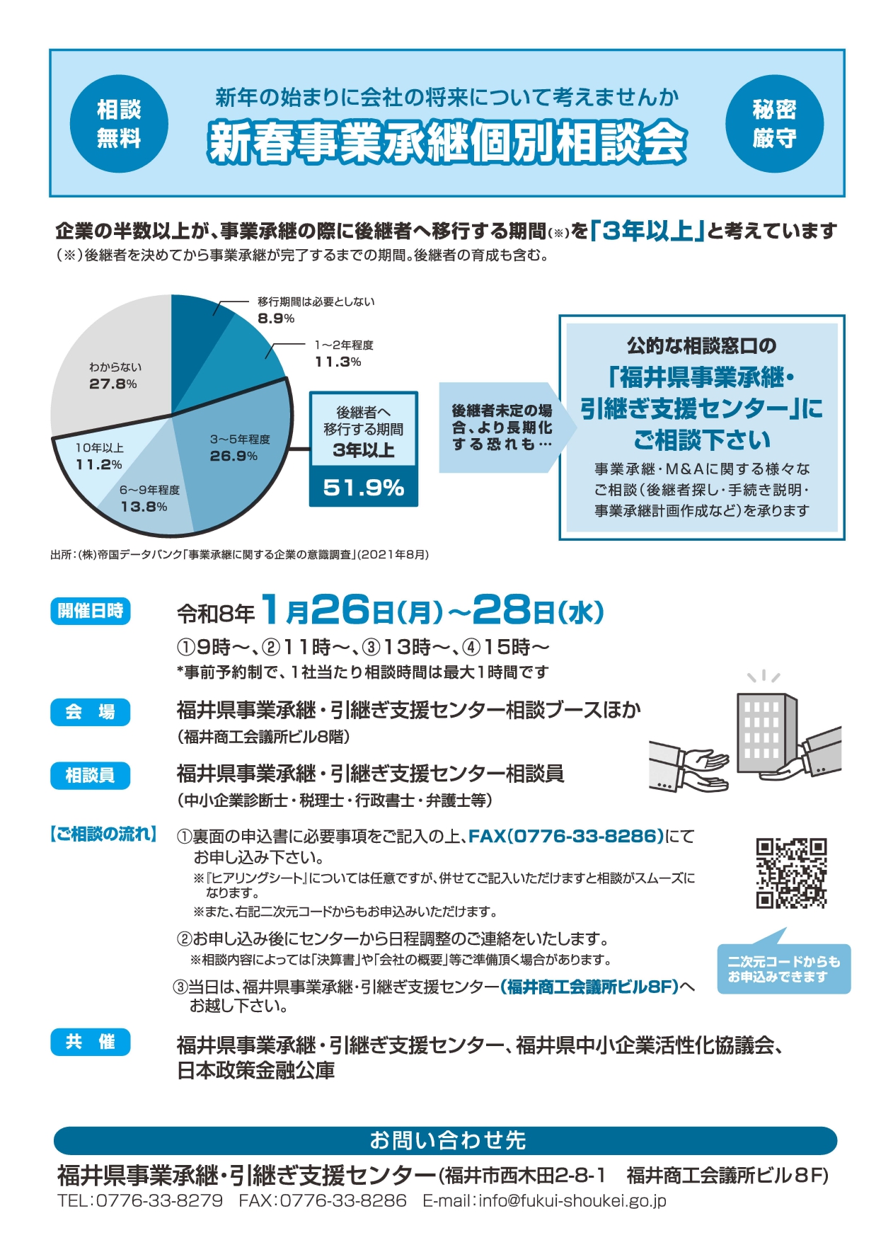 | 相談場所 | 福井県事業承継・引継ぎ支援センター 相談室 (訪問による相談希望の場合はご相談ください) |
