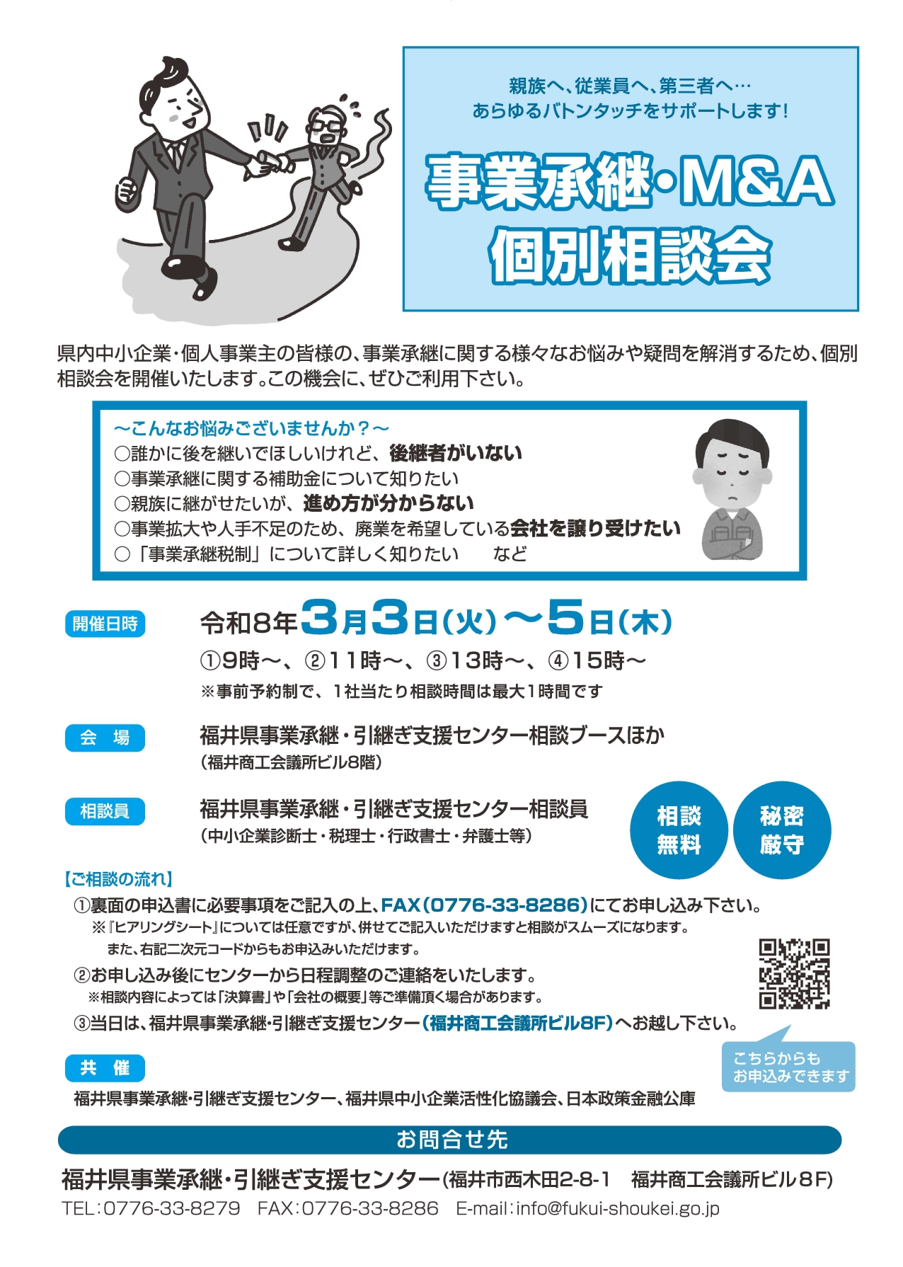 | 相談会名 | [R8/3/3-5]事業承継・M&A個別相談会 共催:福井県事業承継・引き継ぎ支援センター 福井県中小企業活性化協議会 日本政策金融公庫 |